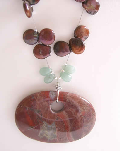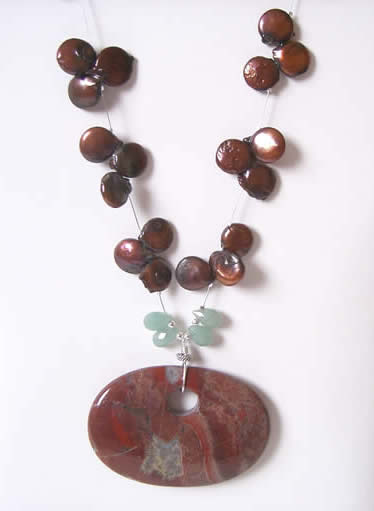 Freshwater pearls, green aventurine teardrops porcelain focal component on satin silver stainless steel wire.